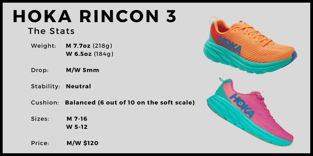 Hoka made the Rincon 3 slightly wider, which my narrow foot wasn’t super thrilled about. They must have gotten some feedback from the hobbit-footed contingent. Fair enough. I still love the shoe and with a synching of the laces it still fits like a glove.